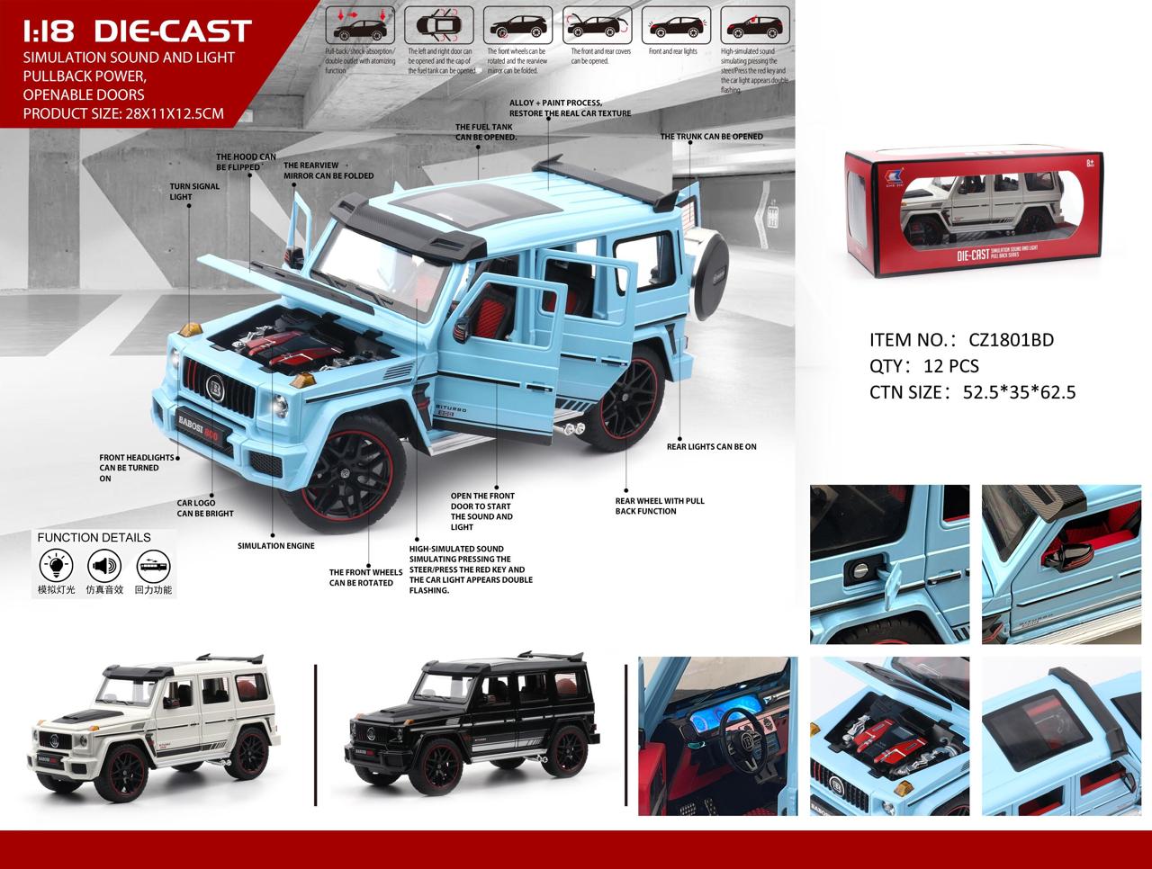 The 1:18 Die-Cast G-Class SUV Model Car is a highly detailed collectible toy designed for both kids and car enthusiasts. Built with a strong alloy die-cast body, this model car features realistic design elements that replicate the look of a luxury off-road SUV.